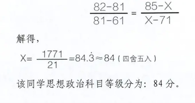 假設某同學思想政治學科原始分為81分,而該學科B等級的原始分分布區間為82~61,則該同學思想政治學科的原始分屬B等級,B等級的等級分區間為85~71,按照轉換公式該同學思想政治學科的等級分為: