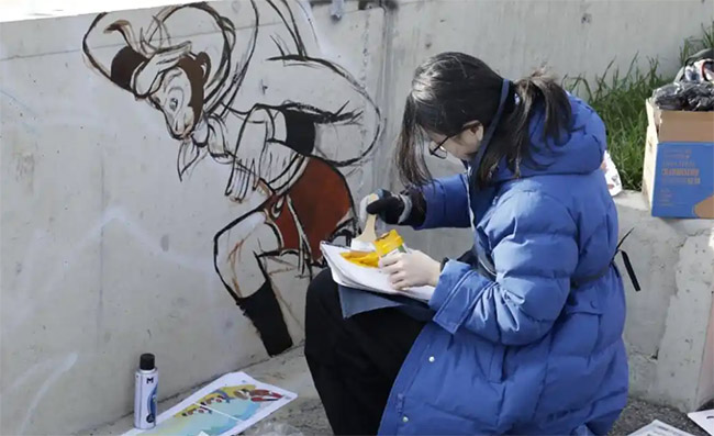 正為《黑貓警長》上色的學生說:“看到自己的作品展示在鄉村路邊,被村民和游客欣賞、拍照,非常有成就感。鄉村振興不只是口號,我們真的可以用手中的畫筆,為鄉村‘化妝’,為地方‘代言’。”