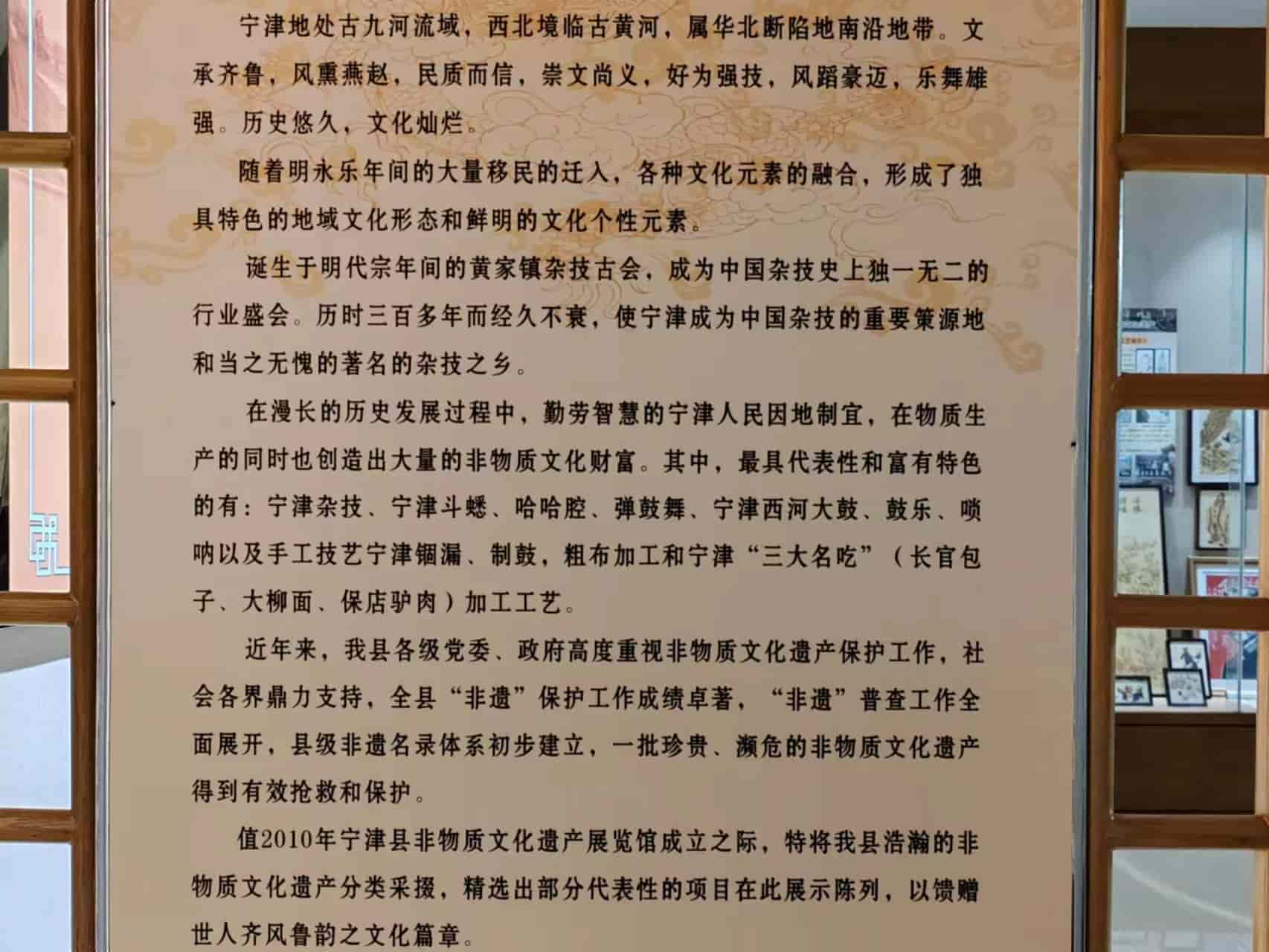 當步入寧津縣非物質文化遺產展覽館時,映入眼簾的便是對于寧津縣非物質文化遺產的介紹,其中,介紹了寧津縣文化的起源與發展。明永樂年間的大量移民的遷入,各種文化元素的融合,形成了獨具特色的地域文化形態和鮮明的文化個性元素。在漫長的歷史發展過程中,勤勞智慧的寧津人民因地制宜,在物質生產的同時也創造出大量的非物質文化財富。其中,最具代表性和富有特色的有:寧津雜技、寧津斗蟠、寧津剪紙和寧津“三大名吃”(長官包子、大柳面、保店驢肉 ) 加工工藝。