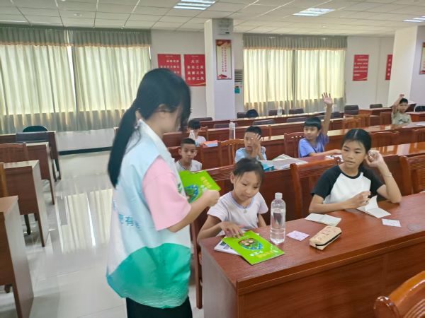 圖為實踐隊向小朋友們發放科普手冊。郭雅蘭 供圖