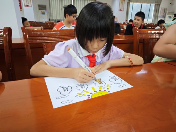 在結束環保宣傳手冊的學習后,隊員們向在座的60位小朋友發起繪畫手工邀請,并一一分發繪畫工具與紙張。隊員們鼓勵著小朋友們用畫筆描繪自己心目中的綠色家園。小朋友們借著五彩斑斕的畫筆,激情發揮自己的想象力,騰躍于一張張畫紙上的綠色家園:是春天隨風搖曳的柳樹、是夏日艷陽下綠油油的小山、是草原里可愛迷人的小花貓。一幅幅畫作充斥著純真的想象與對自然誠摯的熱愛。緊隨其后的手工環節更是精彩絕倫,小朋友們迫不及待地開始創作——剪花鳥、涂色彩,小小的手指翻飛如蝶。"我要剪一只會唱歌的太陽鳥!"小朋友清脆的聲音響起,引得周圍孩子爭相模仿。隊員們穿梭指導,將剪紙技巧與環保知識巧妙結合:"小鳥的翅膀要剪得寬些,就像我們保護森林的大手呀!"教室里笑聲與討論聲此起彼伏,先前畫作中的柳樹和小花貓,此刻在剪紙中躍然重生。當孩子們把完成的作品拼貼在"綠色家園"主題板上時,環保的種子已從筆尖蔓延到心尖,在協作與創造中抽枝展葉。手工環節更是精彩絕倫,小朋友們拿起手工工具、迫不及待地開始創作——剪花鳥、涂色彩,小小的手指翻飛如蝶。"我要剪一只會唱歌的太陽鳥!"小朋友清脆的聲音響起,引得周圍孩子爭相模仿。隊員們穿梭指導,將剪紙技巧與環保知識巧妙結合:"小鳥的翅膀要剪得寬些,就像我們保護森林的大手呀!"教室里笑聲與討論聲此起彼伏,先前畫作中的柳樹和小花貓,此刻在剪紙中躍然重生。當孩子們把完成的作品拼貼在"綠色家園"主題板上時,環保的種子已從筆尖蔓延到心尖,在協作與創造中抽枝展葉。