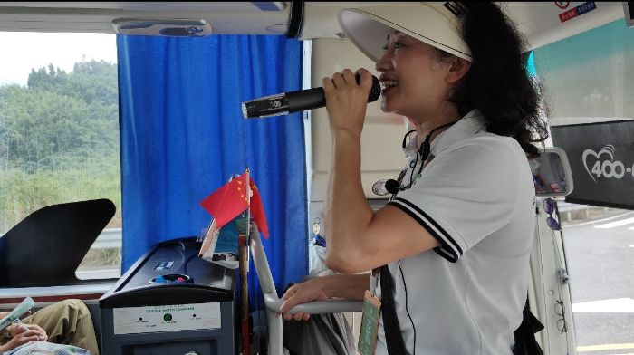 到了我們的觀光車上,志愿者拿起話筒,給大家詳細(xì)介紹各個景區(qū)景點(diǎn),繪聲繪色的描繪著景區(qū)的美麗,并且耐心為大家解答疑惑。對于一些暈車或不適的游客,志愿者會無私的將自己的儲備物資拿出來提供給游客,安撫游客的同時并與調(diào)度中心進(jìn)行溝通。
