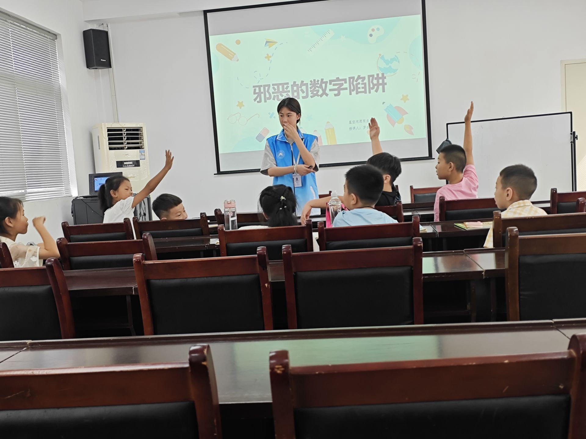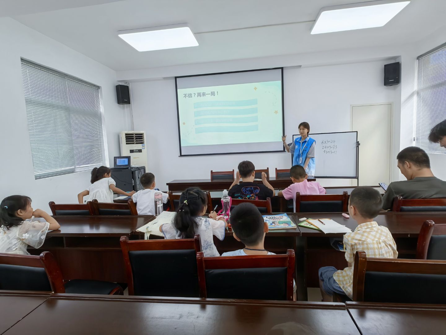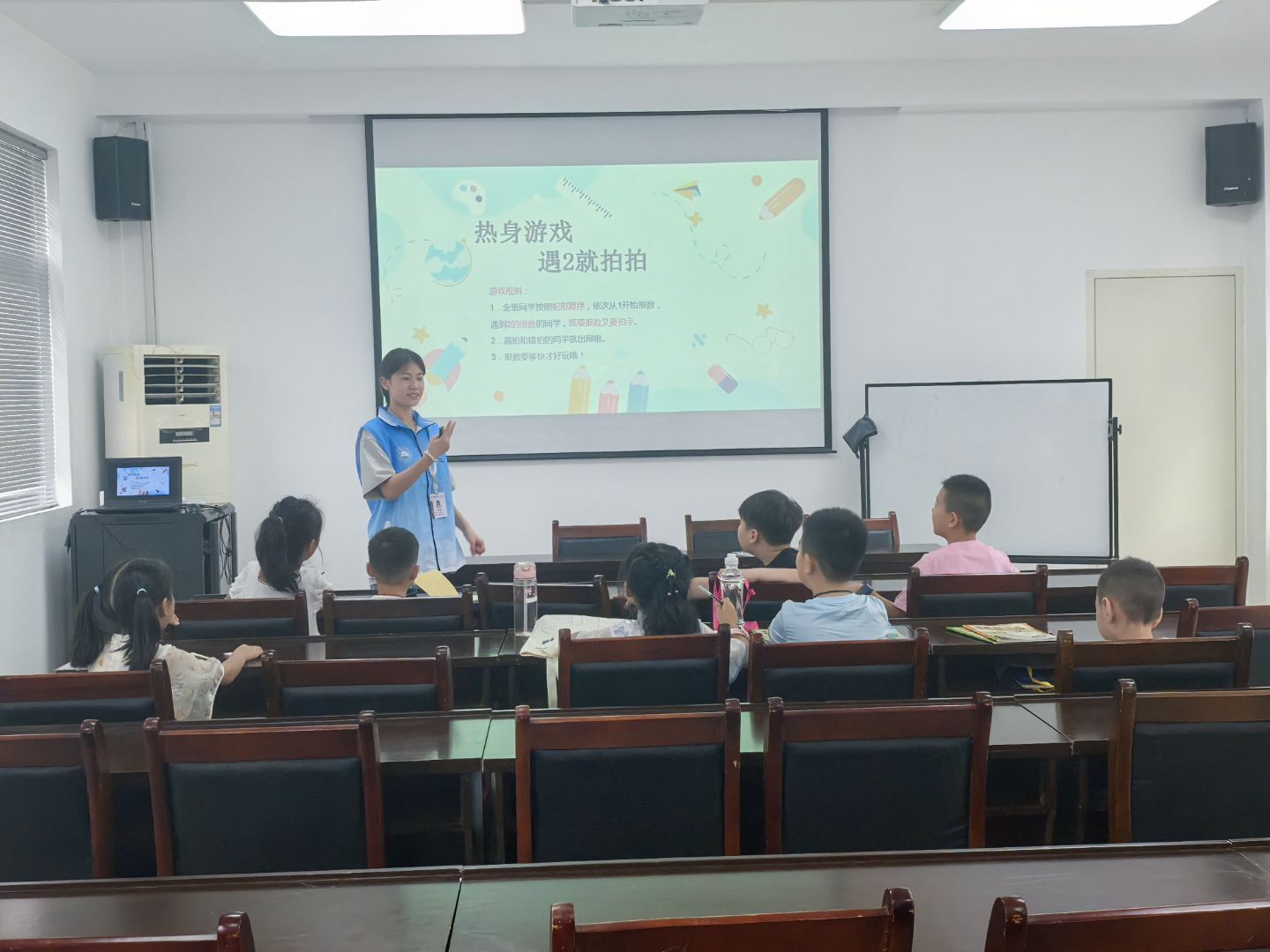 上午九點,特色課程正式拉開帷幕。首節(jié)亮相的是充滿趣味與挑戰(zhàn)的益智課堂,志愿者精心準(zhǔn)備的《邪惡的數(shù)字陷阱》課程,瞬間點燃了孩子們濃厚的數(shù)學(xué)興趣。為了讓孩子們能快速融入課堂,志愿者以一個輕松有趣的熱身小游戲“遇2就拍拍”開場。“1、2!”“啪!”隨著志愿者喊出數(shù)字,孩子們迅速反應(yīng),遇到數(shù)字“2”就快速拍手。一開始,有些孩子反應(yīng)稍慢,手忙腳亂間鬧出不少笑話,引得教室里笑聲不斷。但幾輪下來,孩子們逐漸掌握了節(jié)奏,彼此之間的配合也愈發(fā)默契。這個小游戲不僅讓課堂氛圍迅速活躍起來,更讓原本還有些陌生的孩子們之間距離迅速拉近,變得熟悉親近。